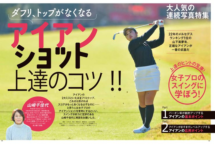 巻頭特集は女子プロの連続写真をふんだんに使用した「アイアンショット上達のコツ」解説は本誌初登場の山崎千佳代プロ。ツアーではトーナメントコースの赤tぃんぐやテレビでのラウンドレポーターとして知られる人気者。アイアン上手でパーオン率上位のプロをピックアップして、そのスイングの良い点などを解析して読者に伝えています。特にアイアンのミスとして取り上げられるダフリとトップのミスがなくなるポイントもピックアップして解説しています。