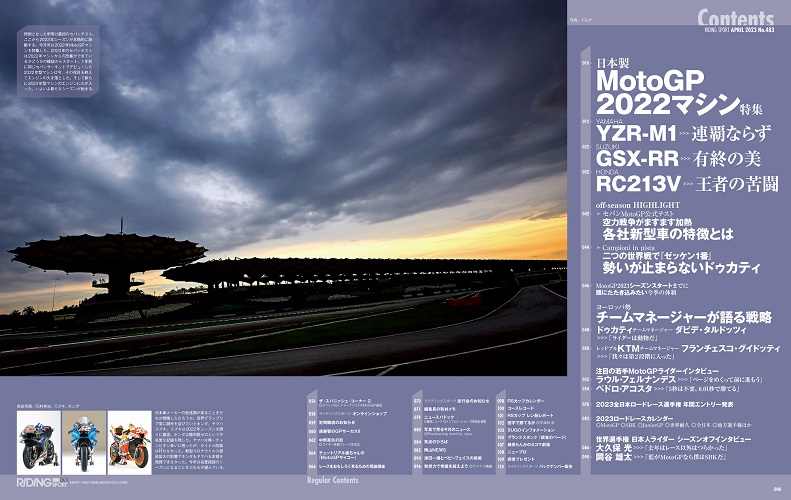 ライディングスポーツ2023年4月号の目次。写真は、2023年シーズン最初のMotoGP公式テストが行なわれたセパンサーキット。冬の間に開発が進められた各メーカーの2023年型マシンが姿を現し、いよいよ新たなシーズンが始まる。
