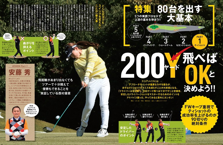 - 巻頭特集は雑誌のコンセプトでもある「80台で回りたい!」を受けて、本格的なシーズンインに向けて、実際のラウンドでは何をするべきかを簡潔に、そして思い切った提言を打ち出しています。