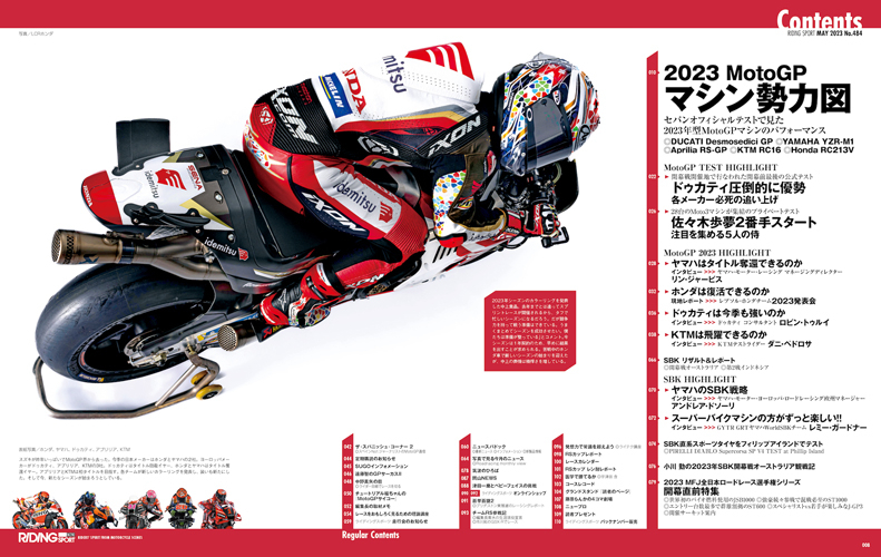 ライディングスポーツ2023年5月号の目次。写真は、2023年シーズンのカラーリングを発表した中上貴晶。