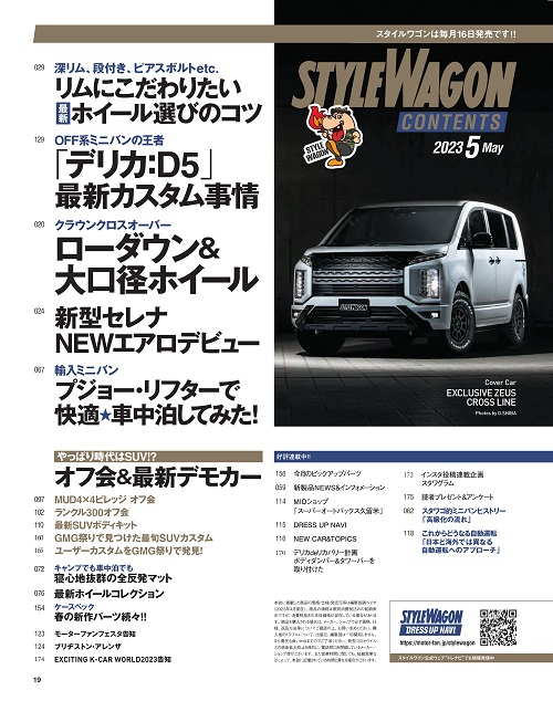 その他、新型セレナのカスタムやプジョーの輸入ミニバン「リフター」での車中泊、注目のSUV最新スタイルまで、カスタムをじっくり楽しめる一冊だ!