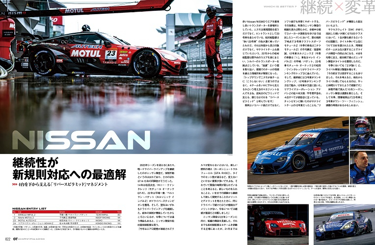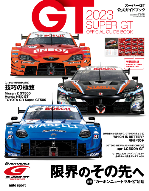 - 日本が世界に誇る“ハコ車”レースの最高峰、SUPER GT。 市販車のボディをベースとすることでファンが身近に感じやすく、「推し」の応援に毎戦数万人の観客がサーキットに来場。 それでいて中身は“モンスター”。世界も認めるハイレベルな戦いでファンを魅了する。 2023年の開幕戦岡山はあいにくの雨。 その結果だけで今シーズンの勢力図を予測するのは困難だ。 その“予測不能”のシーズンを、参戦体制、車両開発技術、全42チーム完全データファイルなど、さまざまな視点から個々の武器を探る。 CONTENTS 002 GT500 Rd.1 OKAYAMA Review & Season Perspective 波乱の開幕──“予測不能”でも見えた個々の武器 020 参戦体制から読み解く、GT500の見どころ WHICH IS BETTER? 継続×変革 028 2023 GT500 Tech Review. 持続可能性を求めて 見据える、その先へ。 030 2014-2023 GT500技術規則の変遷 032 Nissan Z GT500 チャンピオンの正攻法 040 Honda NSX-GT 我慢ならない、許せない 048 TOYOTA GR Supra GT500 50%からの起死回生 056 2023 SPORTING REGULATION 主な規則と今季の変更点 061 SUPER GT DATA ROOM[スーパーGT資料室] 062 2023 SUPER GT GT500 TEAM GUIDE 092 GT300 Rd.1 OKAYAMA Review & Season Perspective 岡山の“乱反射”の中に見えた「今シーズンの対決軸」 102 GT300 NEW MACHINE CHECK apr LC500h GT 想定以上の逸材。 110 GTA-GT300 UPDATE 2023年規定導入で開発競争は新たなフェーズへ 119 2023 SUPER GT GT300 TEAM GUIDE 134 CIRCUIT GUIDE 難易度グラフで見るコースの特性 142 SUPER GT INFORMATION 144 奥付 W特別付録 ・2023年5月始まりカレンダー ・GT500/GT300全車総覧ポスター 関連商品