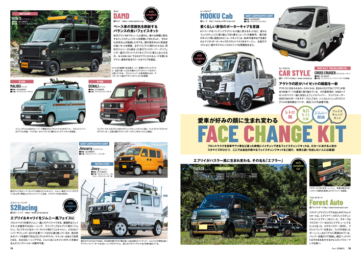 ボビー感覚で顔面交換できるフェイスキットをピックアップ。旧車風からジムニー顔までいろいろ揃っている。