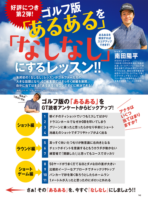 第2特集は、好評だった「ゴルフあるあるを、ナシナシにするレッスン」朝イチのティショットはいつもミスをしてしまうのだが・・・、池があるとどうしてもボールは池に入ってしまうというあるあるを解消します。