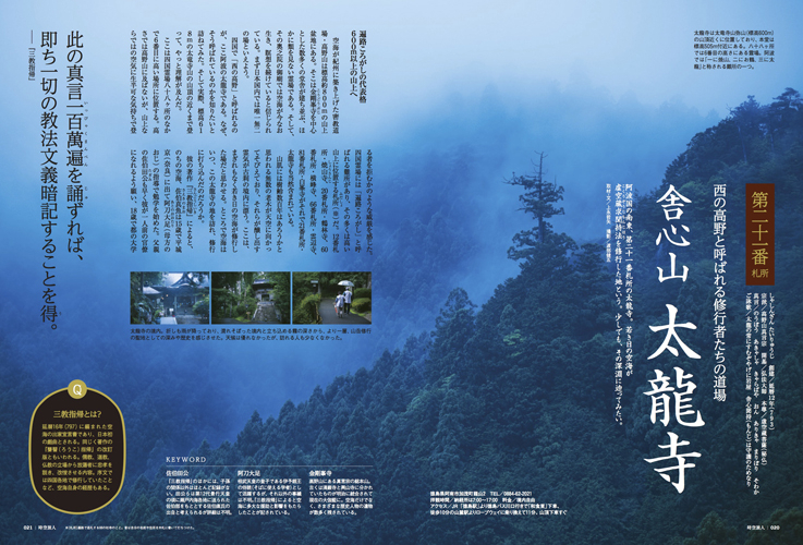 発心、修行、菩提、涅槃の四つの道場に例えられる四国のお遍路。88ある札所の一部を歩き、空海の面影を追ったルポを掲載。