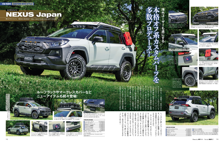 実際にカスタムしているオーナーさんたちの愛車紹介や、最新のカスタムパーツを装着したデモカーのレポート、そして専用パーツを多数収録したカスタムパーツカタログなど、RAV4カスタムの参考になる情報を掲載しています。