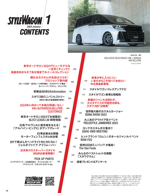 もちろん、新型アルファード&ヴェルファイア情報も、エアロパーツ/ホイール/足まわりと最新トピックスを掲載。さらには、ちょっとしたお悩み相談から大技、コンプリートカーまで、プロショップならではの「匠技」を特集。