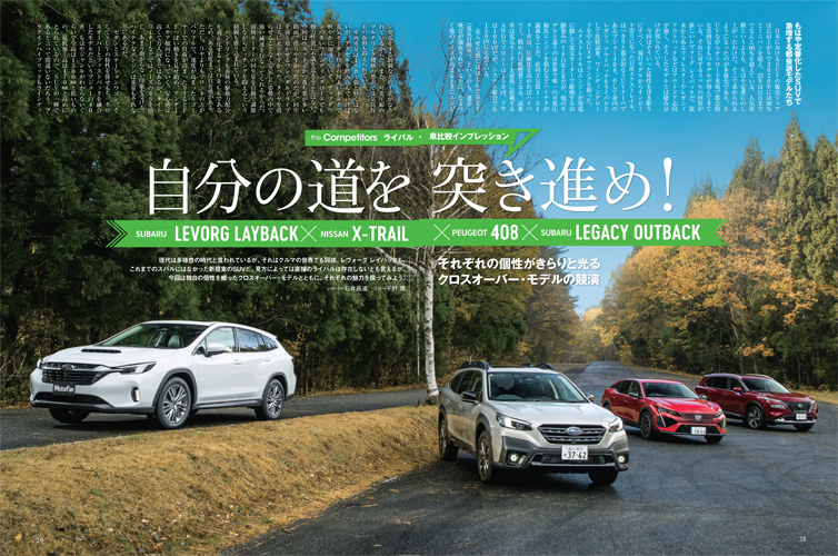 ステーションワゴンをベースにしたSUV……となると実はなかなかライバルとなるクルマが見当たらないのですが、今回はe-POWERを搭載する日産エクストレイル、ハッチバックセダンをクロスオーバーに仕立てたプジョー408、そして同門対決となるスバル・アウトバックとのライバル比較試乗です。