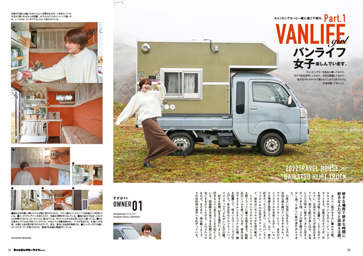 本誌には、ユニークなキャンピングカーライフを楽しむ達人たちがたくさん登場します。その中には女性も少なくありません。