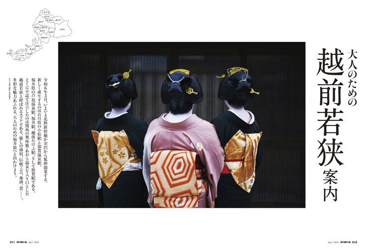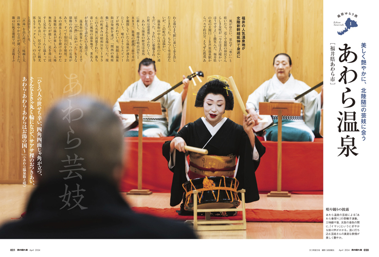 第一特集は越前の名所・名物のゆらり旅。芸妓で知られるあわら温泉や越前和紙などの伝統工芸品から恐竜まで。