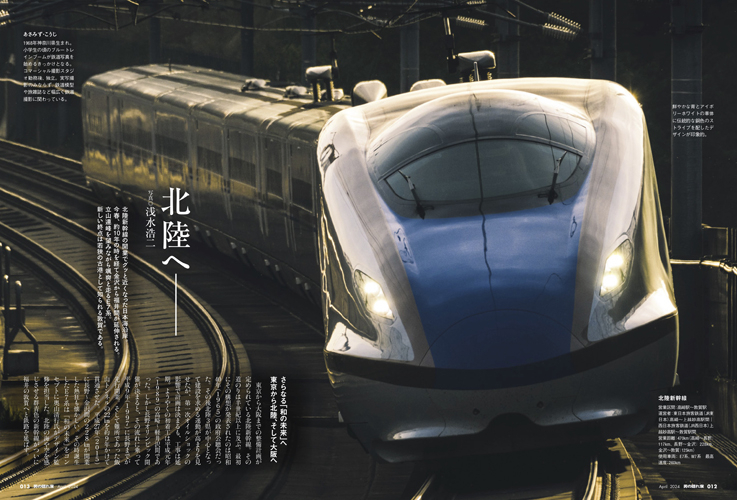 巻頭では北陸新幹線の美しい姿を掲載。今春、約10年の時を経て金沢から福井間か?延伸され、E7系が立山連峰を望みなか?ら颯爽と走る。 新しい終点は若狭の古港として知られる敦賀て?ある。