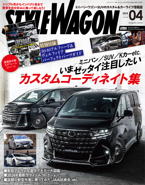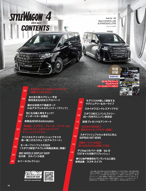 巻頭特集では、そんな40系アルヴェルの最新トピックスが大集合。エアロデモカーから足まわりまで、独自のコンセプトで仕上げた高級ミニバンが色々チェックできる。