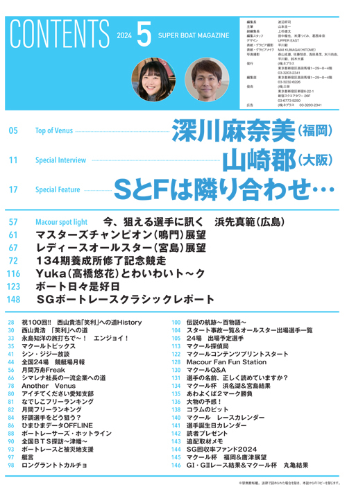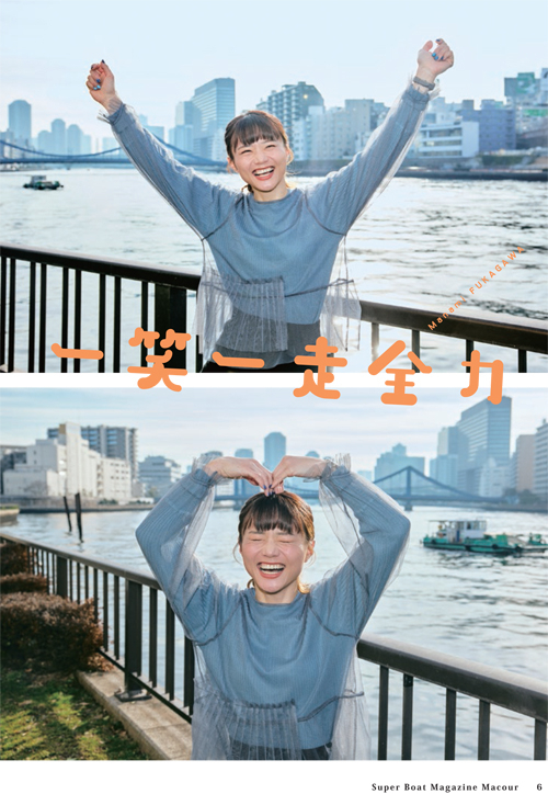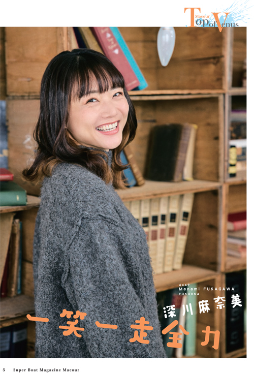 ママさんレーサーとして活躍する深川麻奈美が表紙に登場。女子ボートレーサー写真集「BOAT RACING girls vol.1」以来11年ぶりのグラビア撮影ということで、はじめは緊張の面持ちだったが、徐々にほぐれて笑顔が弾けた。