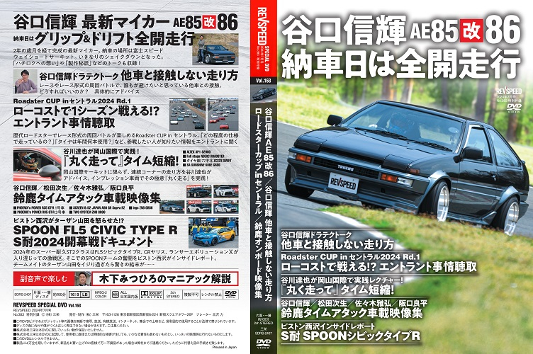 DVDは『谷口信輝 最新マイカーAE85改86納車&シェイクダウン』(誌面にも掲載)、『谷口信輝ドラテクトーク 接触しない走り方』、『Roadster CUP in CENTRAL 2024 Rd.1 本当に気軽に安く参加できるのか? エントラント事情聴取』、『谷川達也ドラテクワンポイントアドバイス 丸く走ってタイム短縮 岡山国際編』、『CLUB RH9鈴鹿より谷口信輝/松田次生/佐々木雅弘/阪口良平 タイムアタック車載映像集』、『ピストン西沢のSPOON FL5シビックタイプRスーパー耐久2024開幕戦ドキュメント』の豪華6本立て。副音声『木下みつひろマニアック解説』も付いています。