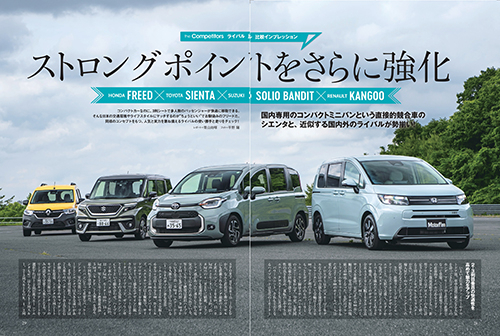 フリードのライバルと言えば、やはりトヨタ・シエンタ。さらにコンパクトスライドドアバンのスズキ・ソリオ。スライドドアと大容量の室内を備えるMPVの海外代表としてルノー・カングーを加えた3台との比較試乗を行ないました。