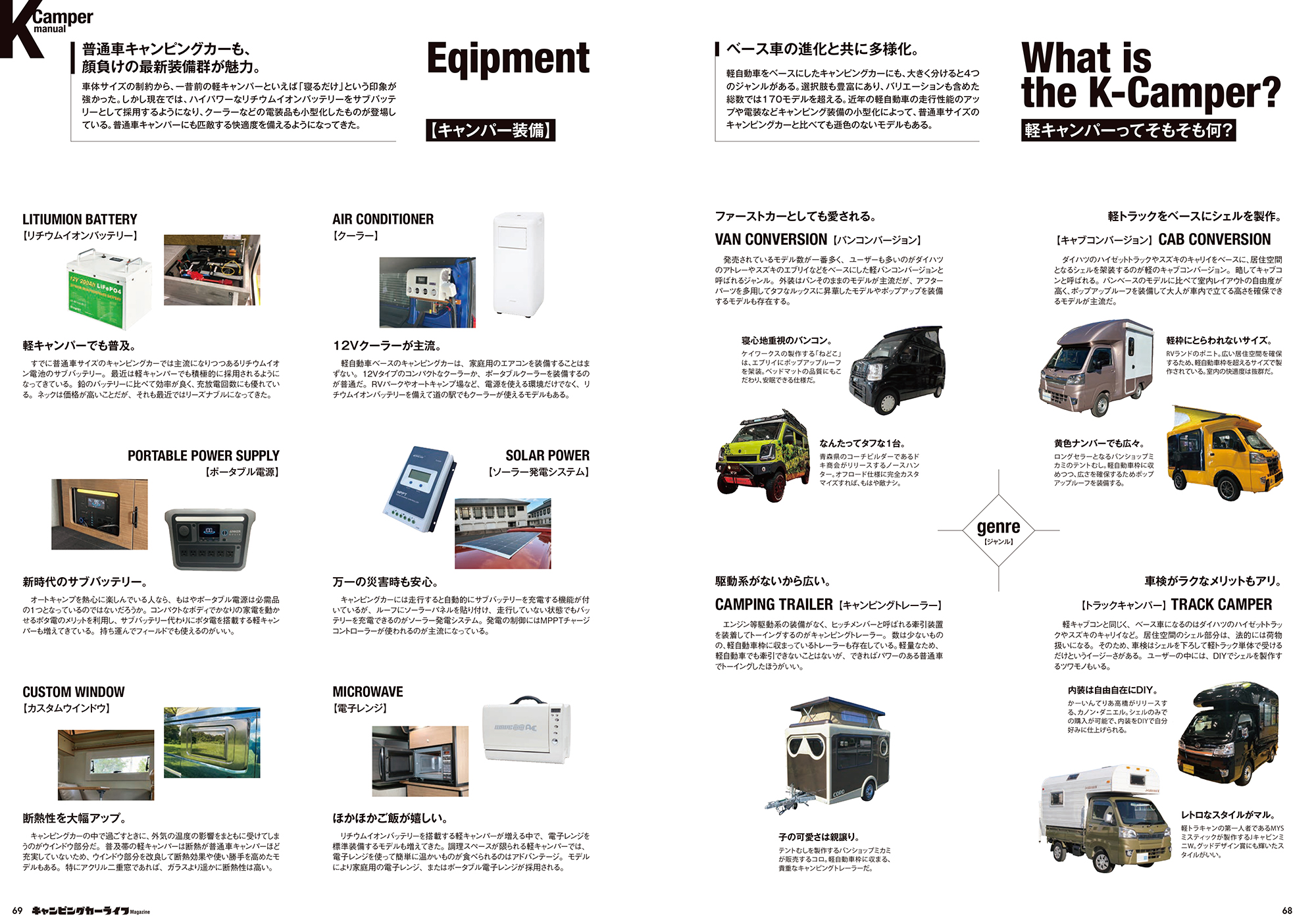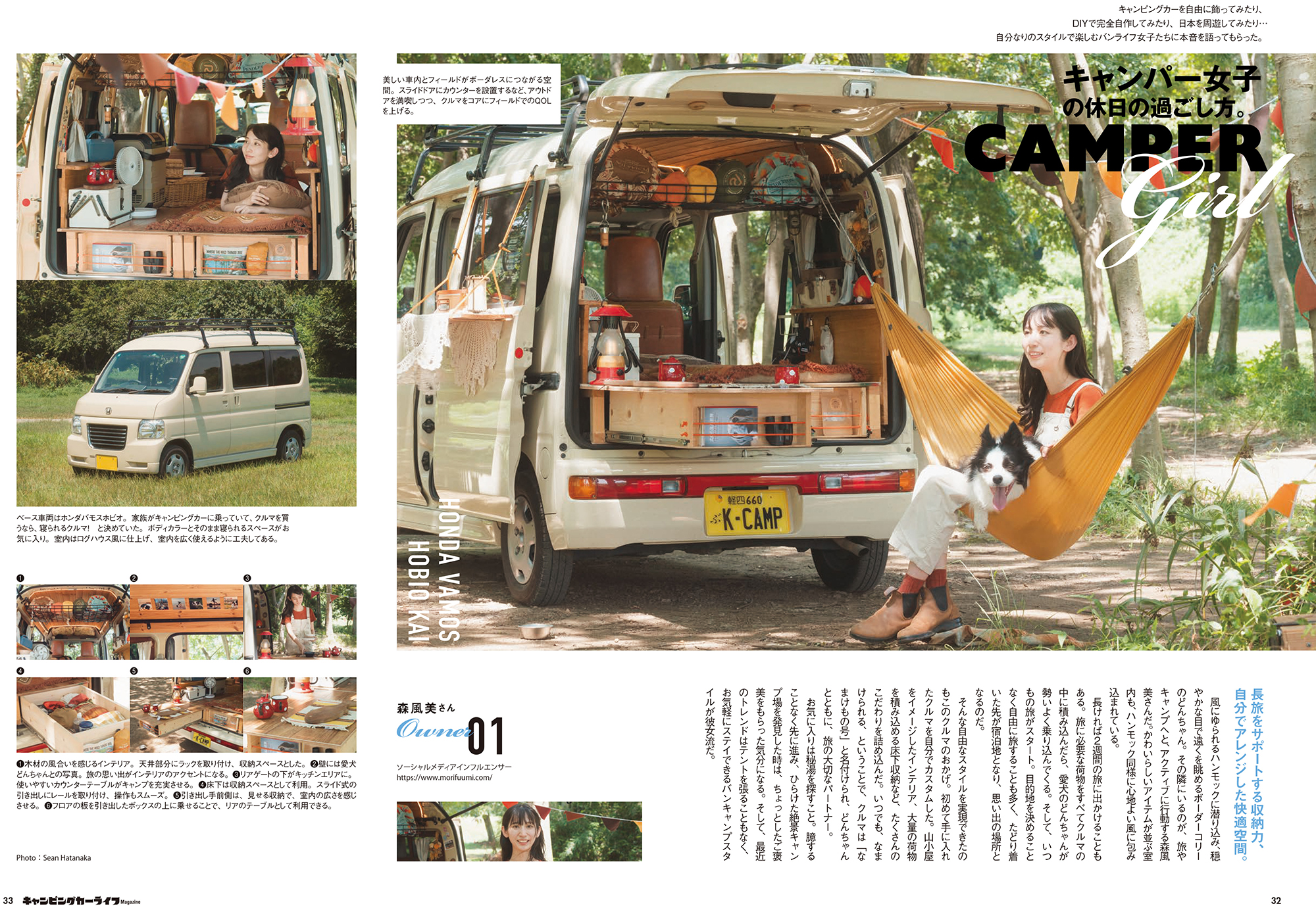 ユニークなキャンピングカーライフを楽しむ達人たちもたくさん登場します。DIYでキャンピングカーを作ってしまった女性オーナーや、「シゴトも遊びもバンライフ」といったツワモノまで。好きが高じて軽キャンパーのレンタルショップを始めたというタレントの松本明子さんにもインタビュー。