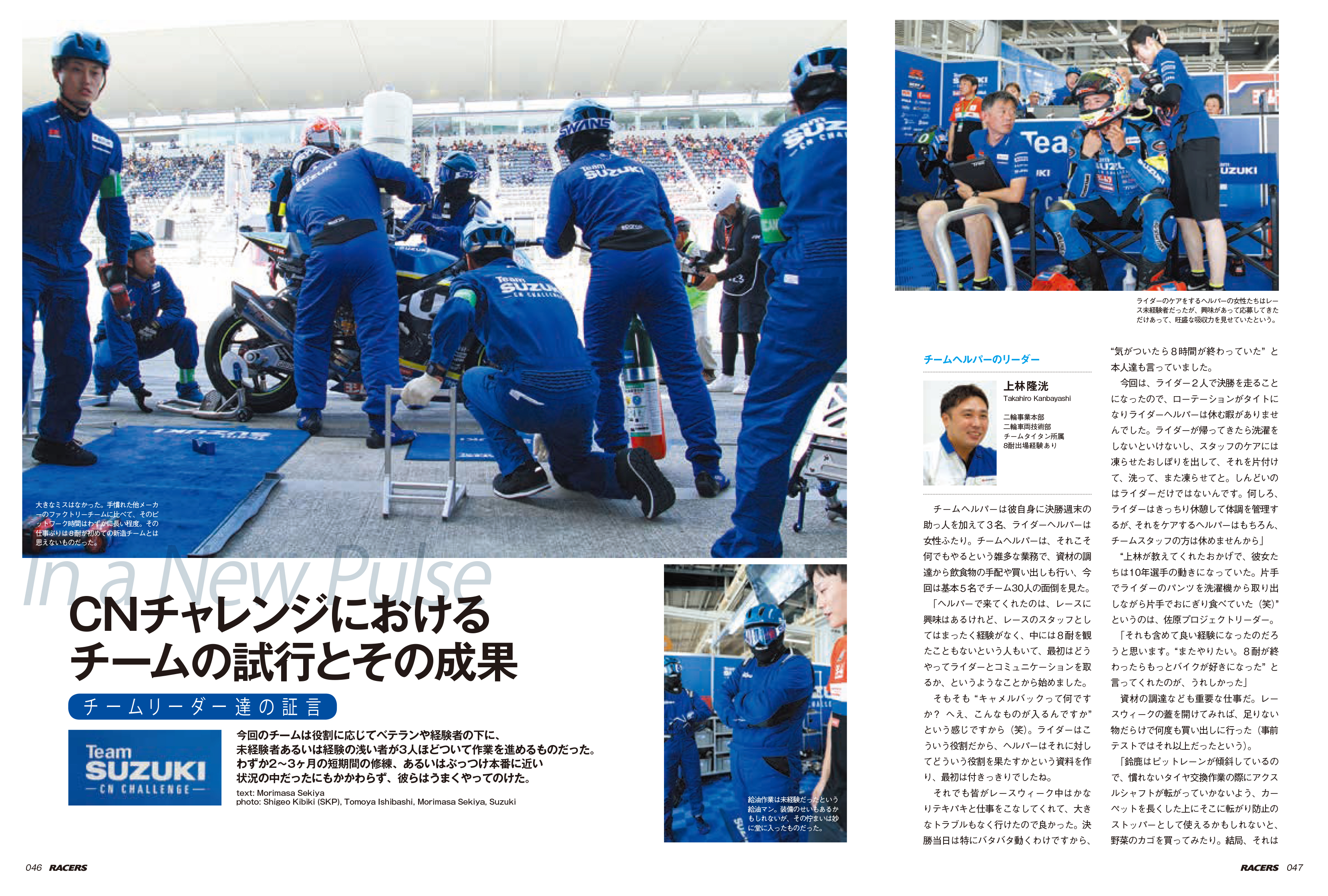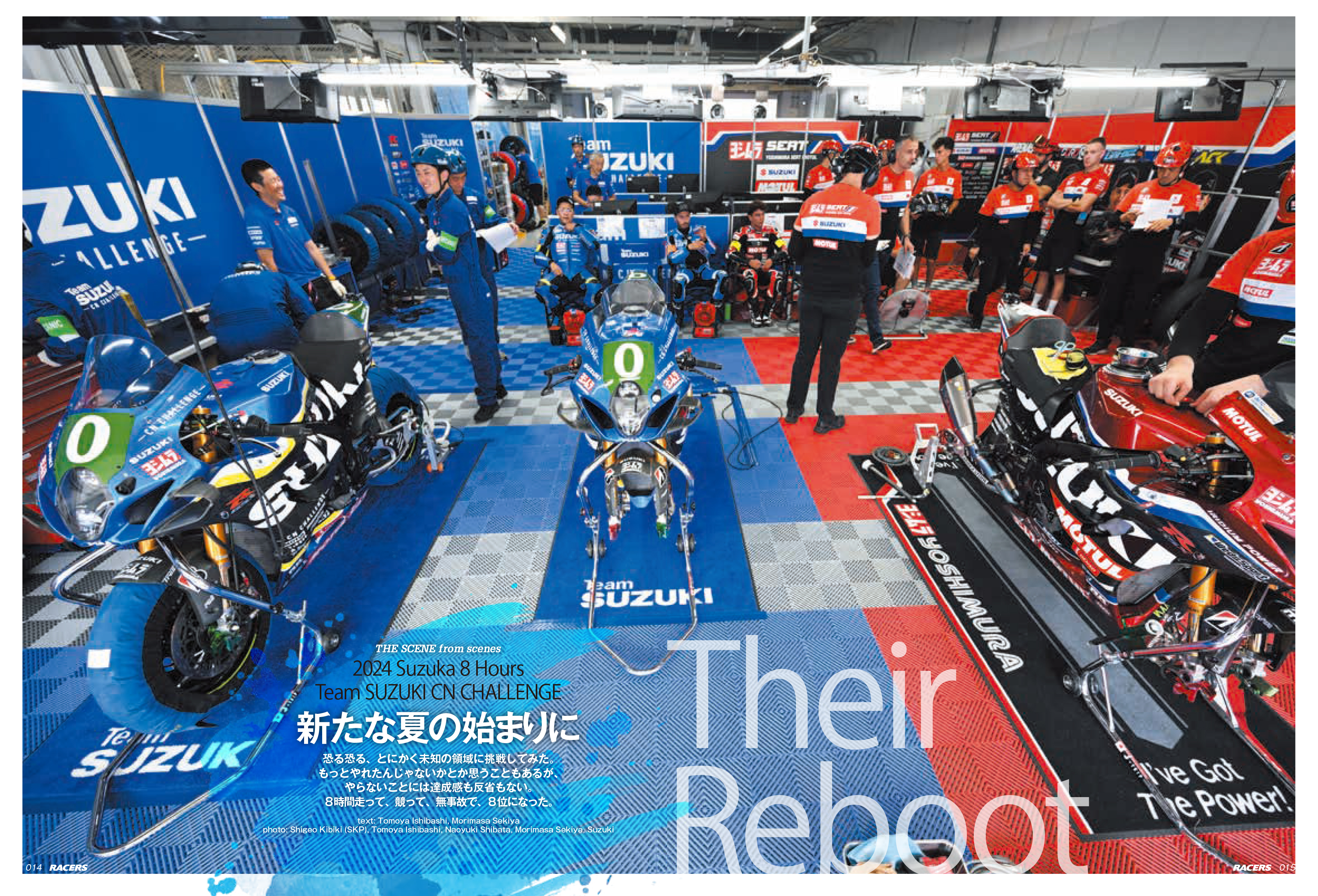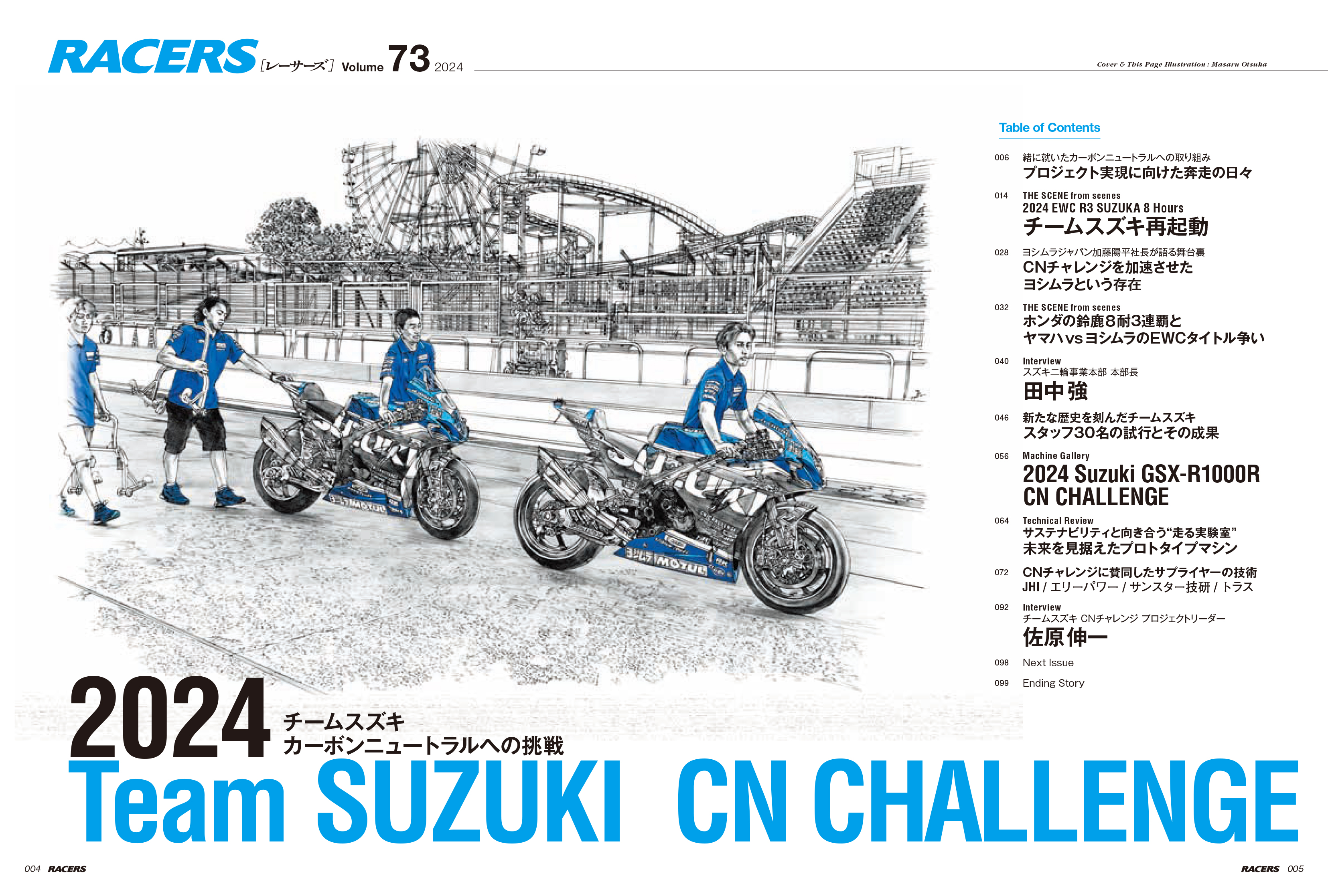 「チームスズキCNチャレンジ」というタイトルのもと、2024年の鈴鹿8耐を走ったスズキの挑戦を詳解しています。“CN”とはカーボンニュートラルのこと。要は、二酸化炭素の排出を極力抑えるとともに、再生可能な素材や技術を使って次世代の二輪レースのありかたを模索するというスズキの新たな実験的挑戦です。その車両が’24年の7月21日に行われた鈴鹿8耐を走りました。結果は8位。並みいる世界耐久チーム、各ファクトリーマシンを向こうに回し、いわば実験周回を重ねたGSX-R1000R CNチャレンジ号は、トップと4周しか変わりませんでした。会社の事情により毎年20戦以上地球上を転戦する世界最高峰クラスへの参戦は2022年をもって終了しましたが、「スズキの戦う姿勢は絶やさない」、「新しい開発課題に挑戦し続けたい」という思いが今回結実。8耐8位から新しいスタートを切っていくスズキの挑戦とその舞台裏をお送りします。