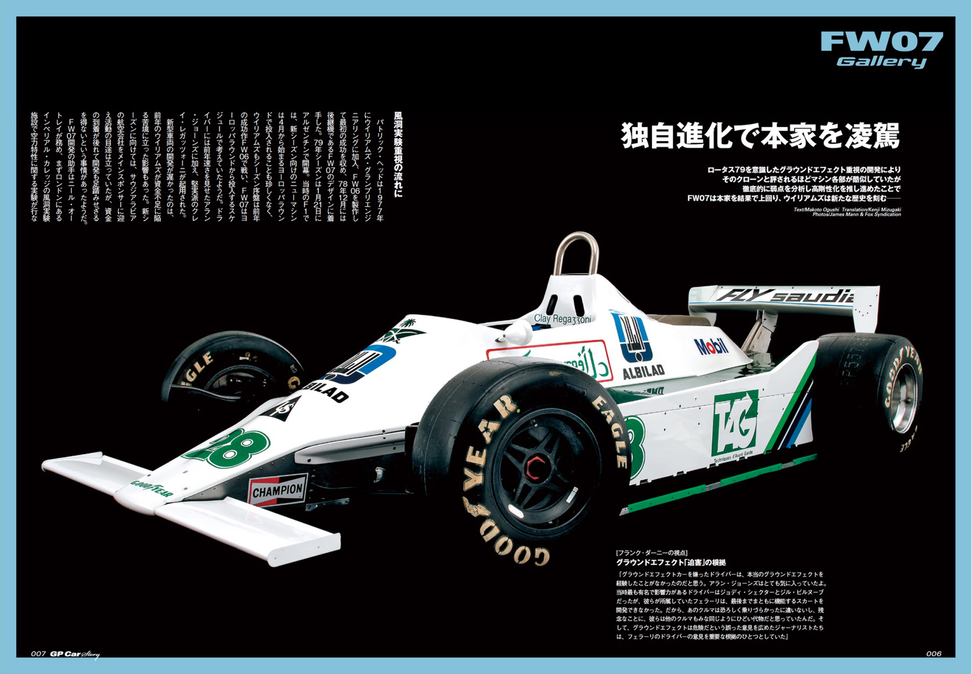 6人ものF1チャンピオンを輩出した現在では名門チームに数えられているが、70年代後半のウイリアムズはたまに入賞するが、ほとんど中団以降に埋もれる1チームにすぎなかった。そのウイリアムズを常に上位で争うだけでなく、ついにはドライバーズ&コンストラクターズの2冠獲得までの強豪チームに躍進させた原動力がFW07だ。前年、天才コリン・チャップマンが投入したウイングカー、ロータス79がF1界を一変。その速さの秘密、グラウンドエフェクトを理解するしないにかかわらず、多くのチームが模倣に走り、コース上には79クローンが多数登場することに。その中でもウイリアムズはグラウンドエフェクトをただ理解するだけでなく、79シャシーの剛性不足も解析。フランク・ウイリアムズとともに新生ウイリアムズを率いたパトリック・ヘッドを中心に、空力エンジニアのフランク・ダーニー、若きニール・オートレイやロス・ブラウンらが手掛けたFW07はウイングカーの本家79を性能ですぐに上回り、投入5戦目でウイリアムズ初優勝(クレイ・レガッツォーニ)。続いてエース、アラン・ジョーンズが3連勝。FW07Bに進化した翌80年も勢いは衰えず、5勝したジョーンズが初戴冠。新加入のカルロス・ロイテマンも健闘し、初めてコンストラクターズタイトルを奪取する。FW07Cとなった81年はコンストラクターズこそ連覇したが、ドライバーズは失ってしまう。とはいえ、改良を加え4シーズンにわたって上位を走り続けたFW07は、ウイリアムズを名実ともにトップへと押し上げるきっかけとなった名車と言えるだろう