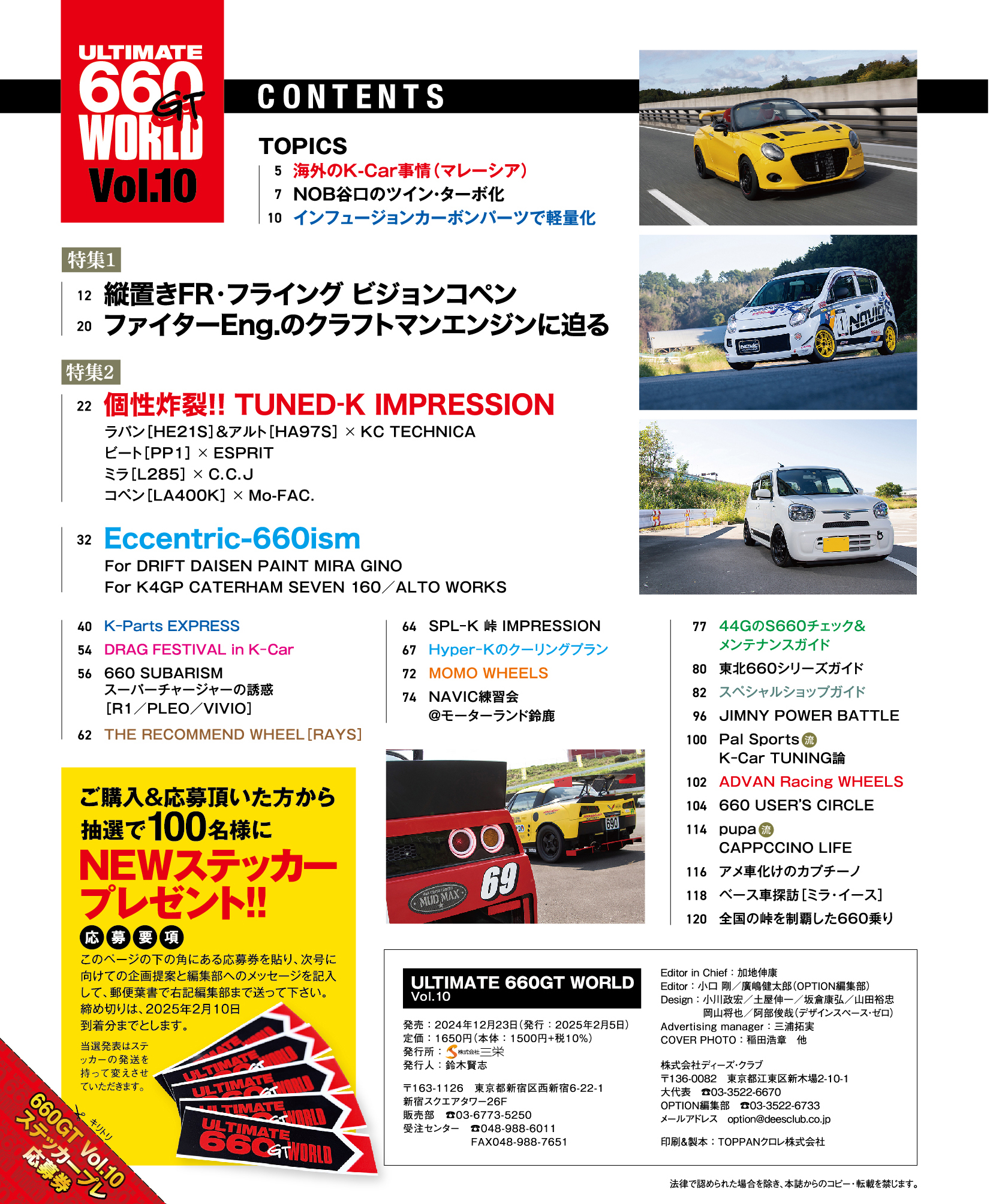 K-Carチューンにターゲットを絞りながらも、方向性は多岐に富んだものとなっているVo.10の掲載内容や車両をチラ魅せしていこう。