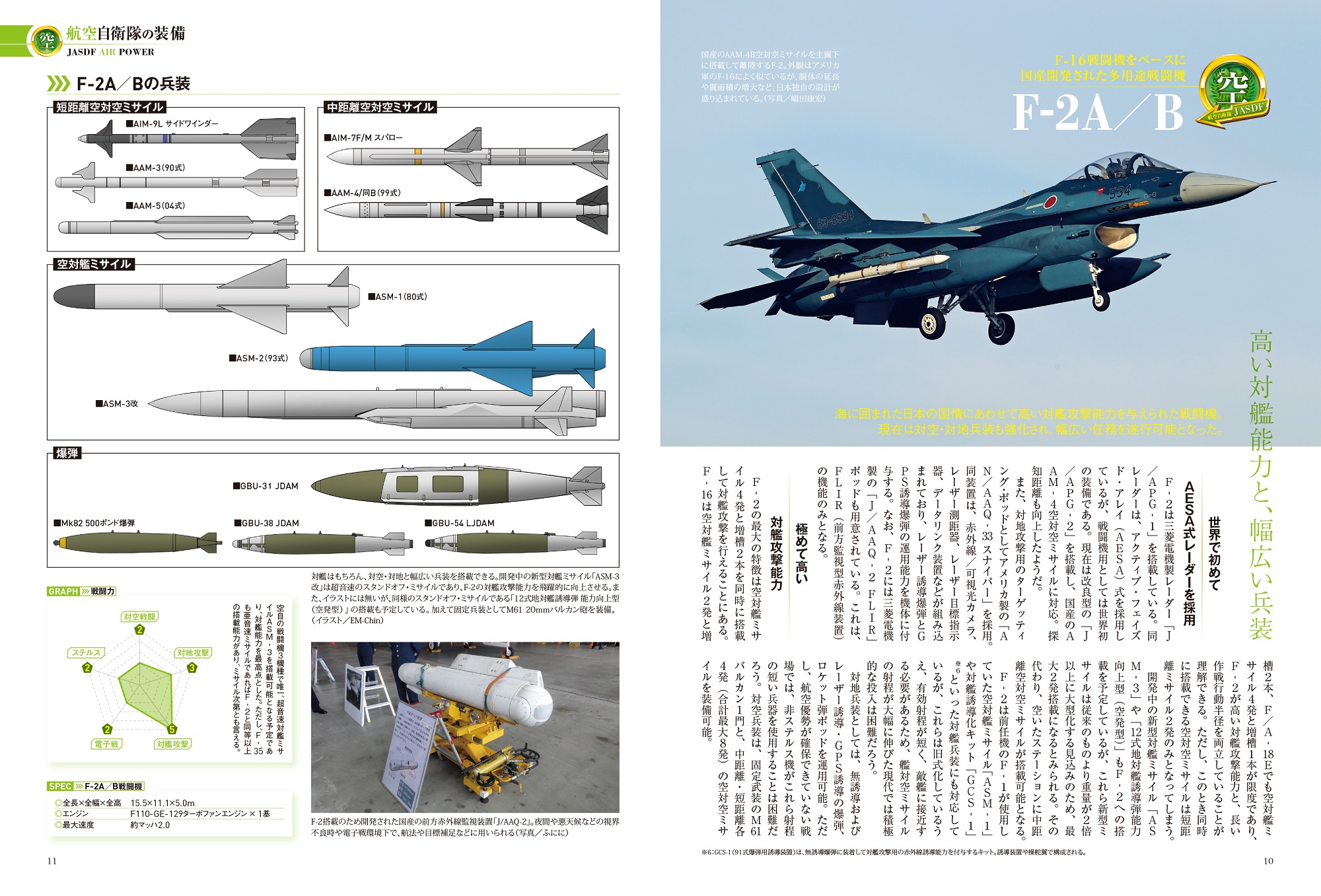 航空自衛隊が運用する戦闘機3機種(F-35、F-2、F-15)について、搭載兵装と攻撃能力をイラストつきで解説。