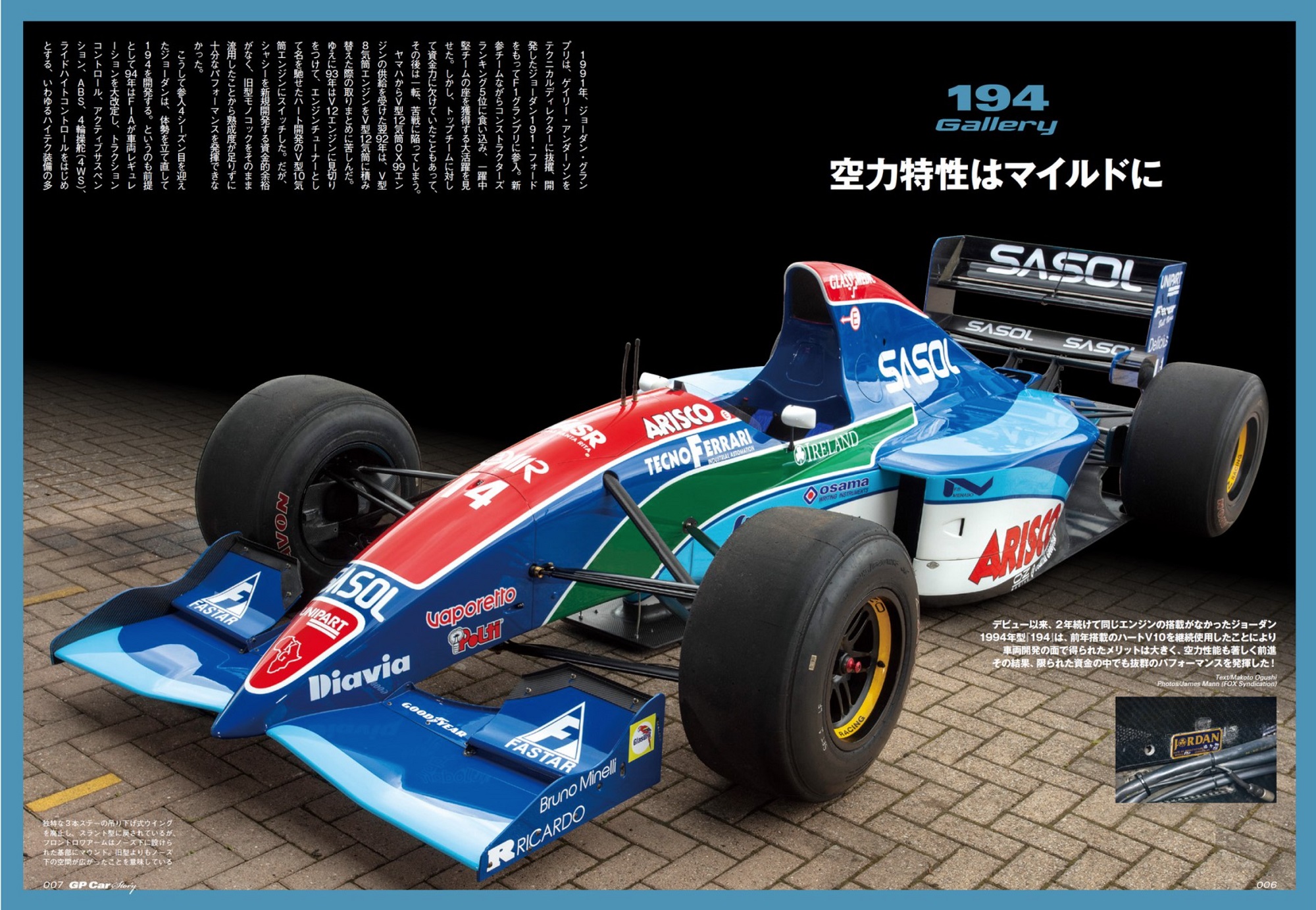 - 2005年限りでジョーダン・グランプリの名前はF1から消滅した。あしかけ16シーズンにわたる活動で4勝を記録し、ドライバーズ、コンストラクターズ両選手権でも最高3位を記録するなど、F1の歴史的に見ても成功したチームの部類に含まれるのは間違いない。しかし、決して強豪チームとだったわけではない。不思議とこのチームはいいところまでいくが“限界突破”できないところがチームカラーなのだ。何度も名を変え、今もその“後身”はF1に参戦し続けてるが、限界突破できないところはジョーダンのままに思えてならない。衝撃的なデビューを果たすも、2?3年目は完全に存在感を失い、下位集団を形成する1チームに成り下がったが、転機は1994年にやってくる。コンストラクターズ5位で終えた参戦4年目のアイルランドチームは、初のポールポジション&表彰台獲得と、しっかり結果を残した。その後、ジョーダンは中断グループのトップを担うチームのポジションを確かなものへとしていく、そのきっかけとなったシーズンが紛れもなく94年だった。F1史上大波乱のシーズンとなった94年を好成績で生き抜いた自信が、その後、彼らを真のF1チームへと押し上げることになる