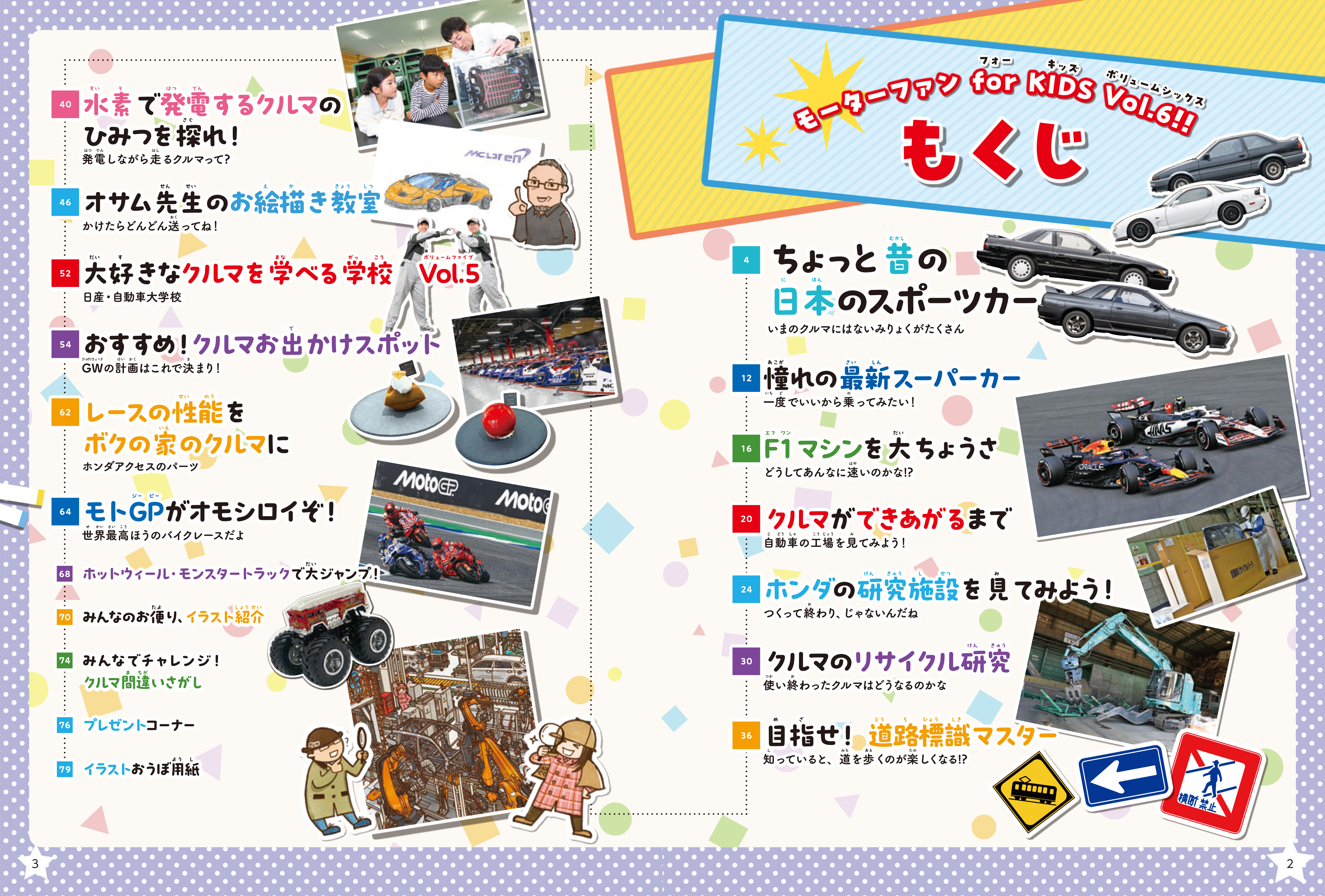 他にも道路標識のまめ知識やゴールデンウィークに行ってみたいクルマお出かけスポット紹介、他にも好評連載企画のクルマの書き方教室など、楽しいページがいっぱい!