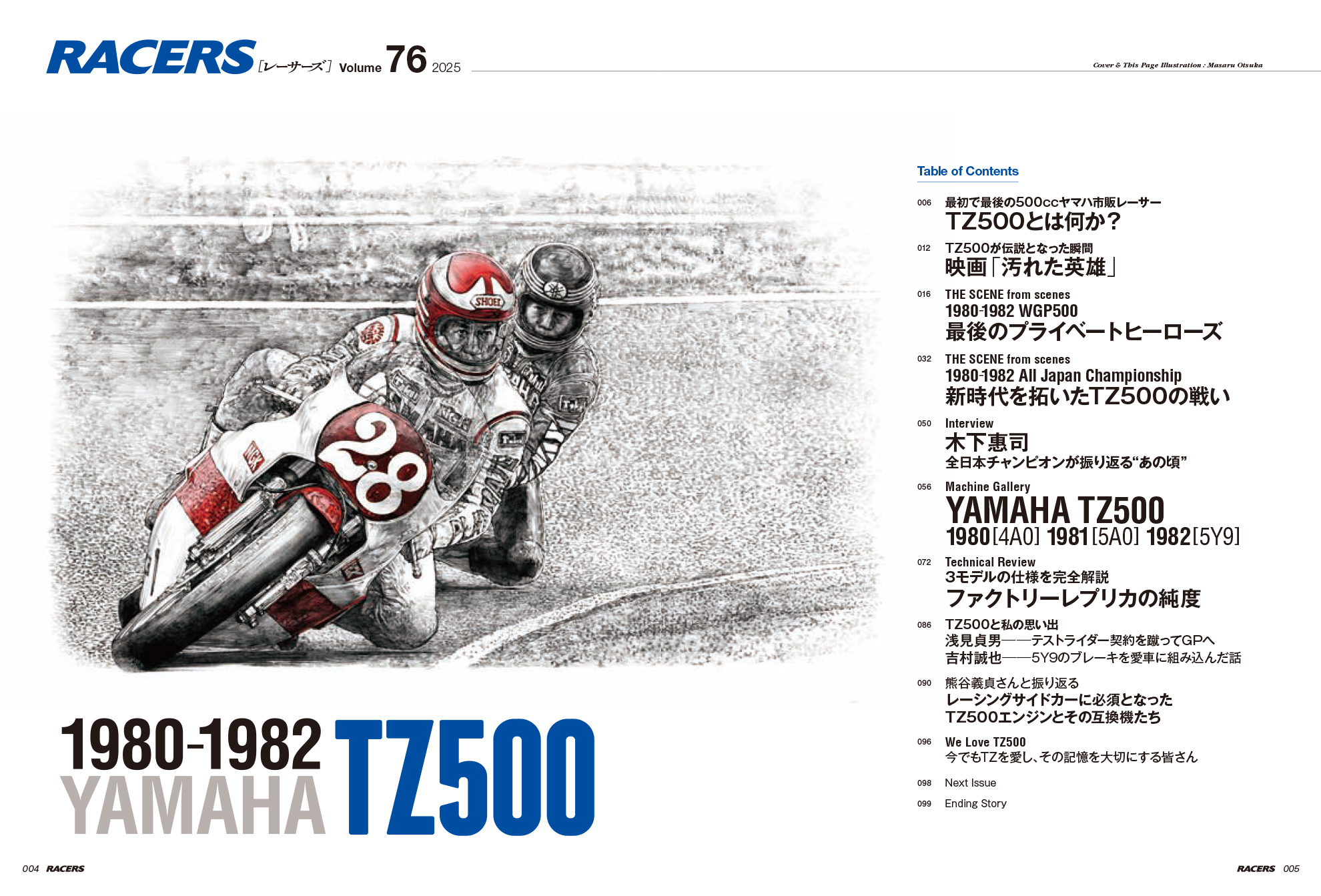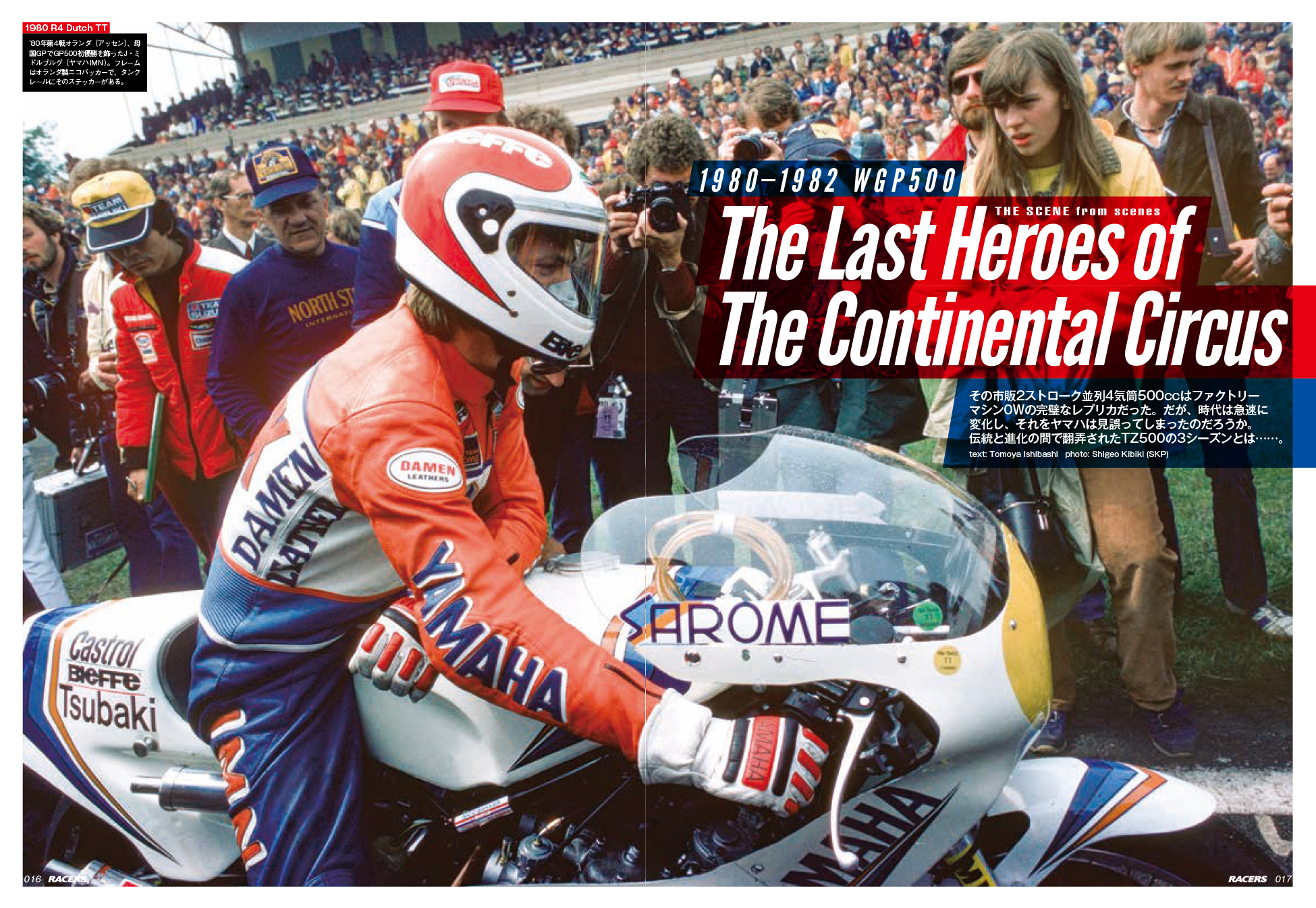 『レーサーズ』Vol.76はヤマハの500cc市販レーサー「TZ500」を特集しています。「市販レーサー」とは広く一般のライダーに販売されたレース専用マシンのこと。対して「ファクトリーマシン」はメーカー契約のライダー専用車。前者は不特定多数のライダーが乗るという性格上、性能も部品の耐久性も「安全率」を多く取って開発されました。時は1980年。世はまだバイクブームが巻き起こる前でしたが、ヤマハは250㏄のそれ、TZ250に続いてTZ500を発売。高額商品な上に、使用が極限のレースシーンとなるので、その開発や組み立て、生産には細心の注意がはらわれました。ゆえに、このクルマはファクトリーマシン「YZR500」の開発陣が担当。いわばTZ500はYZR500の完全レプリカモデルだったのです。そんなYZRレプリカ=TZ500の開発・製作の舞台裏を詳解します。ちなみに'82年に公開された角川映画『汚れた英雄』に使われた車両も、このTZ500でした。