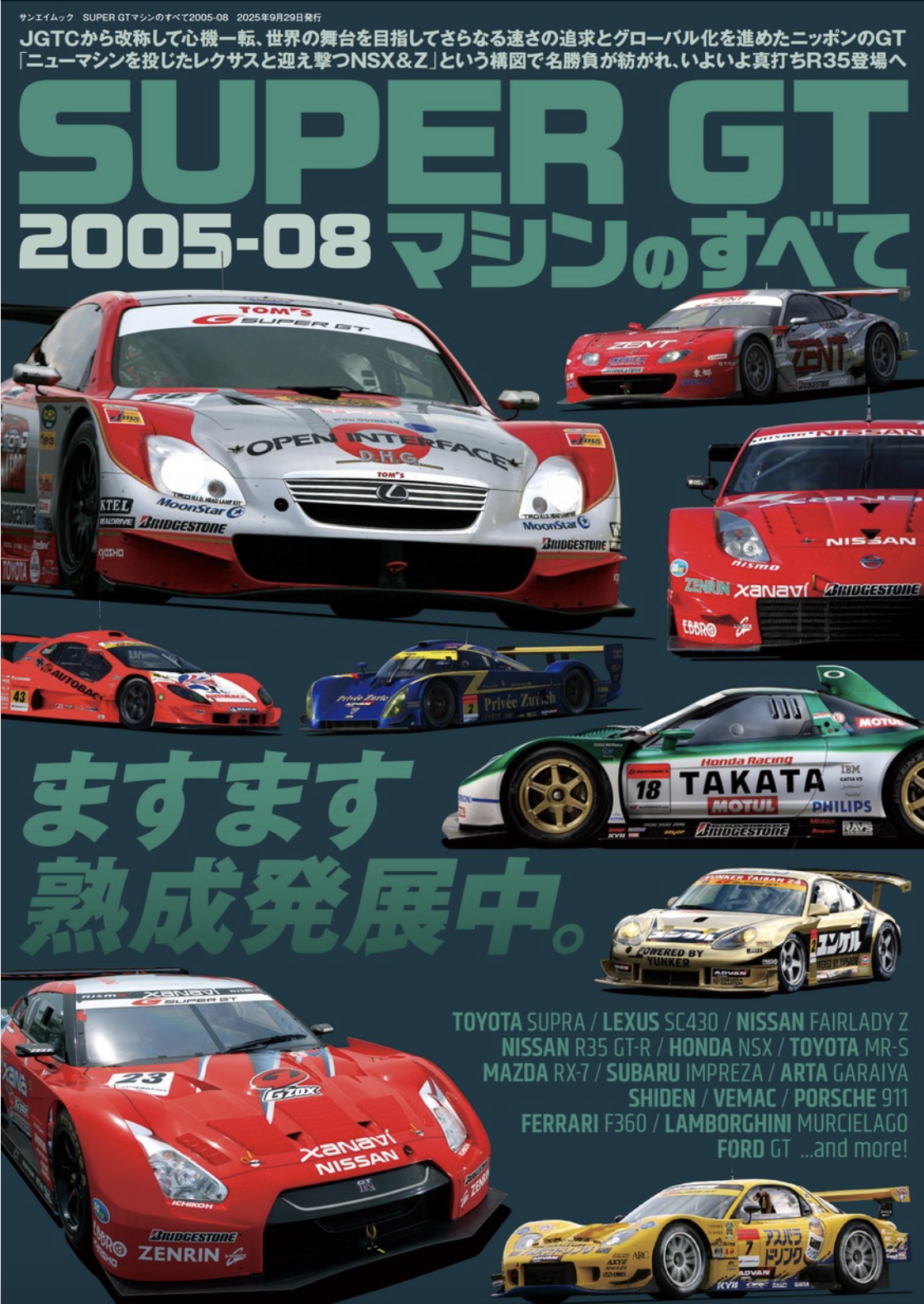 毎年春と秋に刊行しているA4正寸サイズ・税別1100円の「めくってもめくってもレーシングカーだらけ」なムックの最新刊、今年は夏にも刊行です。今春刊行した『WRC グループBラリーカーのすべて』に続く今号は2023年に同じく刊行済みの『JGTCマシンのすべて』の続刊という位置付けです。「スーパーGT」へと改称した1年目=2005年から08年まで、4シーズンの間に出走したGTマシンたちを対象としています。