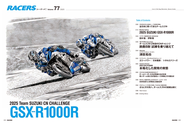 『レーサーズ』Vol.77は2025年8月の鈴鹿8耐を走り抜いたスズキのGSX-R1000R を特集しています。2年目を迎えたチームスズキCNチャレンジは、ファクトリーとしての活動を本格化させ、マシン開発を主眼に全日本ロードにもフル参戦することになりました。そこで改良、熟成を続けた’25年型ファクトリーGSX-R1000R(開発コード:XRJ8)はどのようなものなのか、本誌では全日本開幕前のテストから8耐直前の竜洋テスト(静岡は旧竜洋町にあるスズキの二輪テストコース)までチームに密着。その一部始終を見届けてきました。また、ファクトリーライダーとなった津田拓也氏やレース活動を統括する新旧事業本部長の対談インタビュー、チーム員の証言などファクトリーの活動を掘り下げた内容となっています。