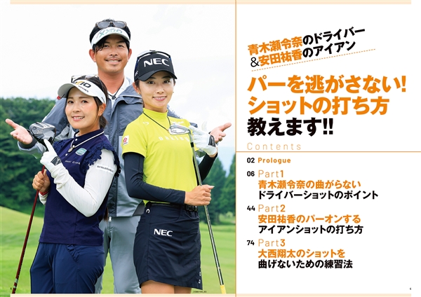 ドライバー ショットは 青木瀬令奈 が、アイアンショットは 安田祐香 が担当。構えからスイング、フィニッシュまで、それぞれの得意クラブの打ち方を丁寧に教えてくれます。